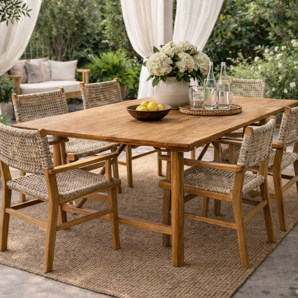 De Tuintafel Palo is een tijdloos en robuust meubelstuk dat warmte en karakter toevoegt aan iedere buitenruimte. Deze tafel is vervaardigd uit gerecycled teakhout, wat niet alleen zorgt voor een duurzame keuze, maar ook voor een unieke uitstraling.